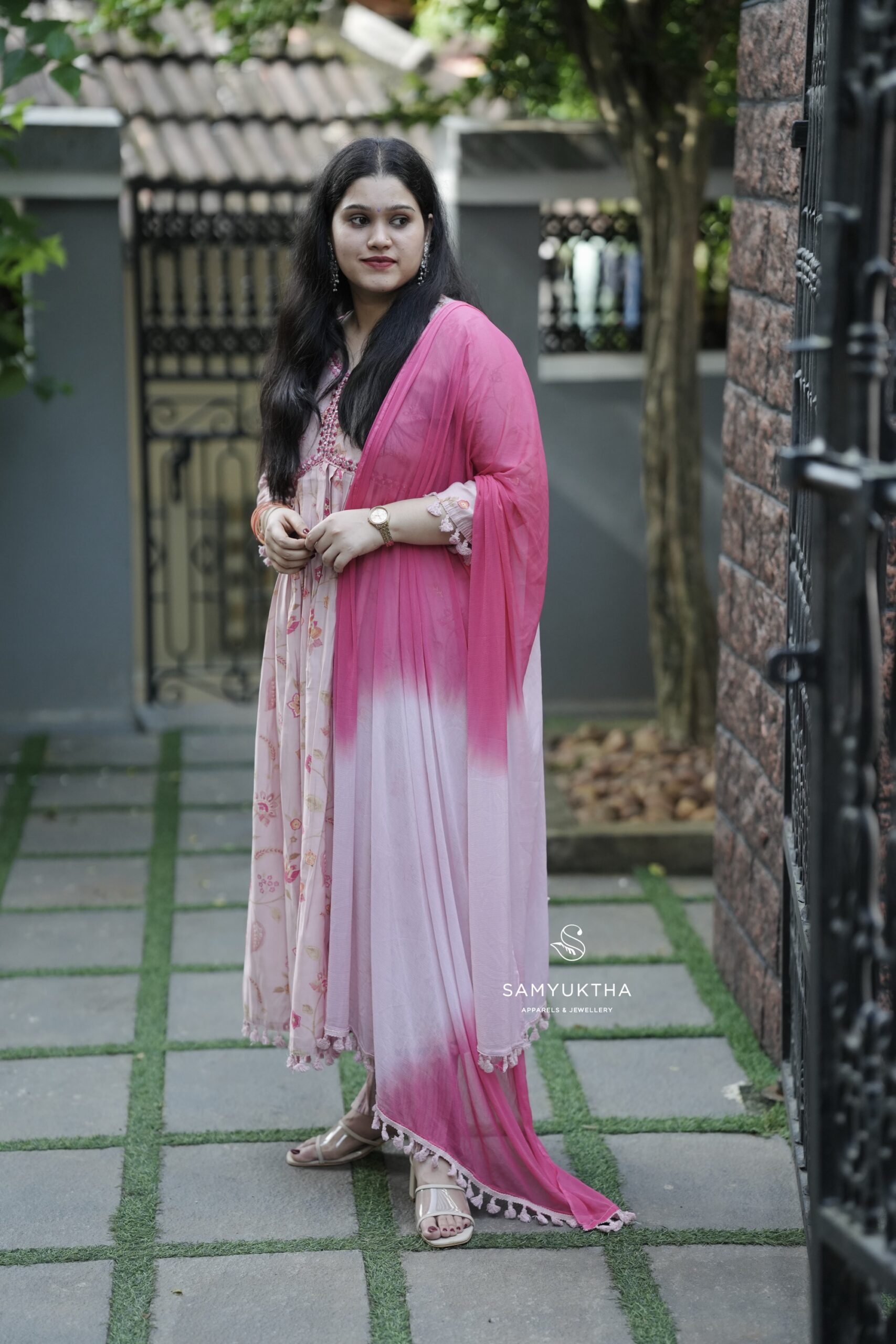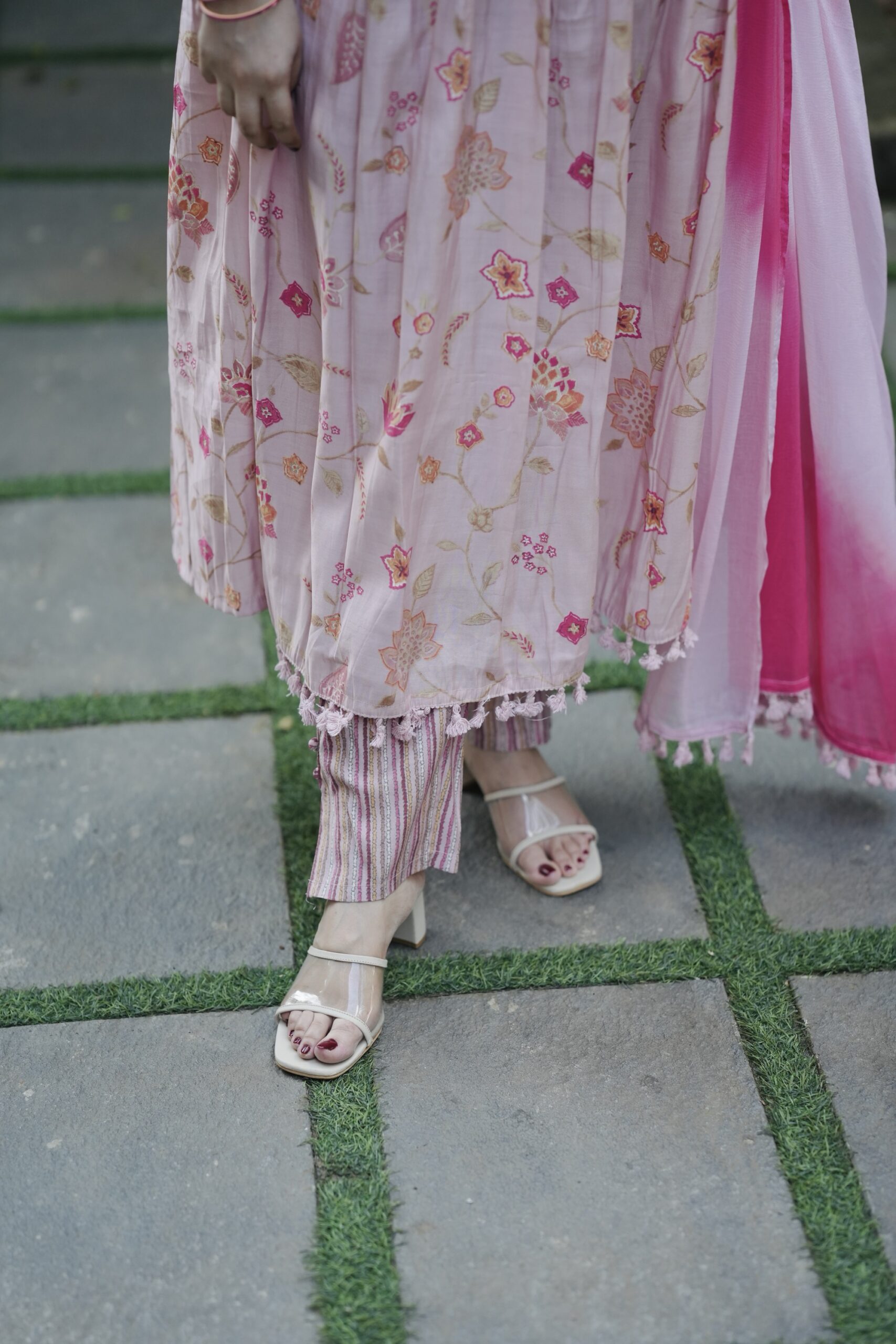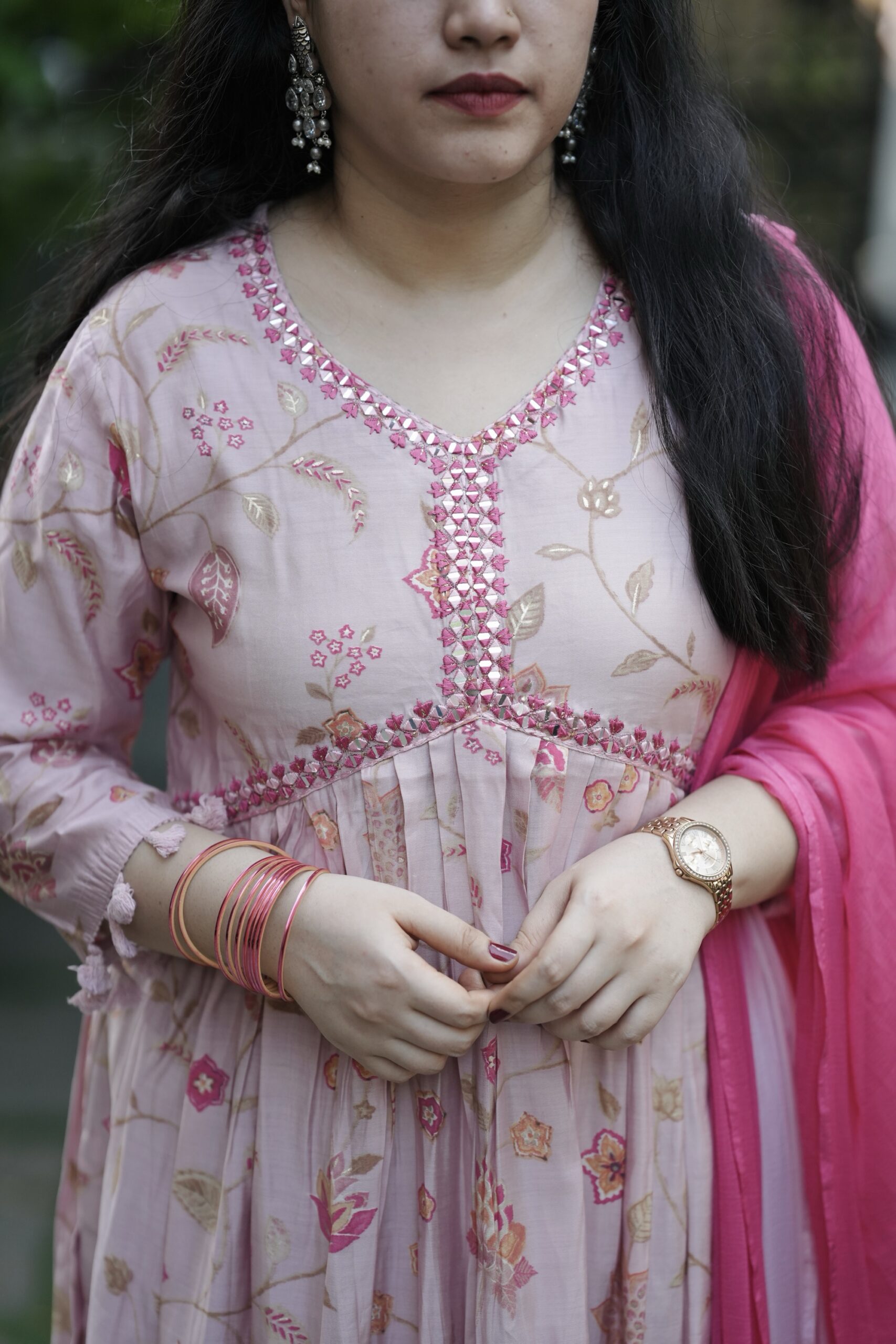 beautiful blend of soft and bright! This pink floral premium nyra-cut kurti with delicate mirror and embroidery work is perfectly elevated by a gorgeous chiffon dupatta. Feminine and vibrant for any daytime occasion.