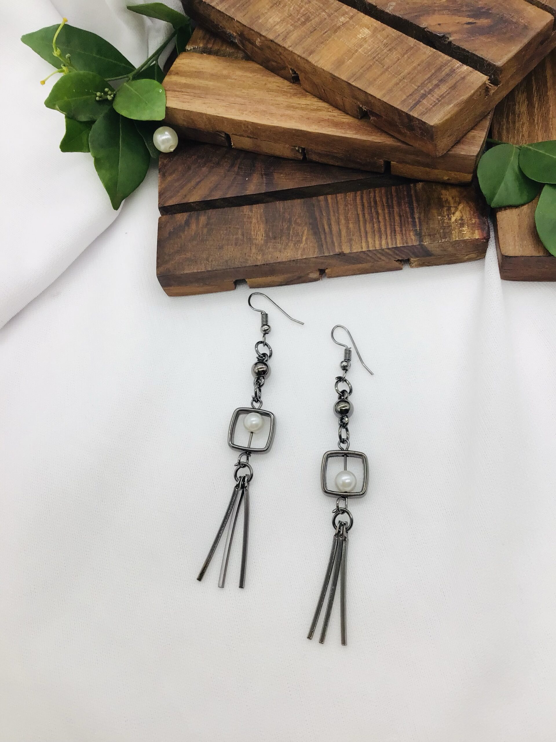 gunmetal-tone long dangle earrings featuring a square-shaped accent that frames a single white pearl. The earrings hang from a beaded chain and are finished with a small tassel of three thin metal bars.